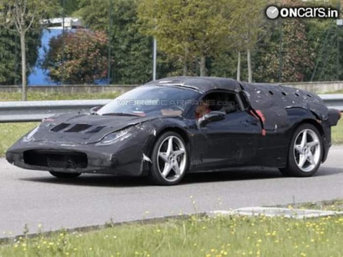 The images have been snapped in Germany, where the Prancing Horse was out testing its future range-topper on a secret high-speed track. As seen in the images, the test mule is covered in fully loaded plastic cladding, which has kept various important elements of the car hidden, such as the car's rear wing, leaving more to the imagination. The only visible element that looks new, not to mention stunning is the rear wheel design, which hasn't been used on any other Ferrari model so far. Other key highlights are the flat front nose and the rising rear wings, which resembles to the 458. Rest of the parts on the prototype seems to be borrowed by other Ferrari models such as the makeshift light assemblies and some other components.