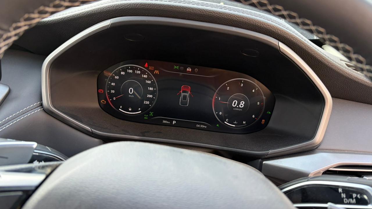 The cabin utilizes a “Smoked Ebony” dual-tone theme (black and grey) featuring soft-touch dashboard surfaces. Control interfaces consist of a 12.3-inch infotainment display and a digital driver’s cluster, with physical toggle switches for climate settings located below the vents.