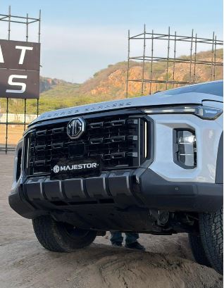The Majestor is characterized by its large octagonal gloss-black front grille and a split vertical headlamp configuration. LED daytime running lights are integrated along the bonnet and within the grille. To emphasize its off-road styling, the vehicle includes satin silver skid plates and extensive body cladding.While the profile is reminiscent of the MG Gloster, the Majestor has larger dimensions. It is equipped with 19-inch dual-tone alloy wheels and features black finishes on the door handles, roof rails, and mirrors.