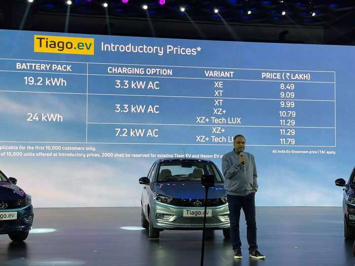 Tata Tiago EV Launch LIVE: Tata Motors on Wednesday launched its smallest electric car, the new Tiago EV. The all-electric hatchback has been introduced at a base price of Rs 8.49 lakh, going all the way up to Rs 11.79 lakh (both prices, ex-showroom). Tata Motors says that this price is applicable for the first 10,000 customers who book the Tiago EV. The new Tiago EV has various new features such as connected car features with smartwatch compatibility, cruise control, leatherette seat covers, and re-gen modes. The hatchback is already sold with petrol as well as a CNG powertrain. Tata Motors also claims that the Tiago EV is capable going from 0-60 km/h in just 5.7 seconds thanks to the 55 kW motor that is mated to the long-range battery pack. The smaller battery pack, on the other hand, comes with an output of 105 Nm of torque and will do the said sprint slightly slower.Tiago is the most affordable electric car in the Indian market. This new EV will join the brand’s electric vehicle range, including the Tigor EV, Nexon EV Prime, and Nexon EV Max.