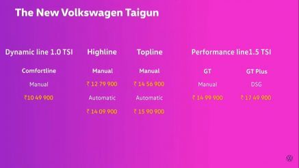 The new Volkswagen Taigun is being offered in Dynamic Line with 1.0-litre TSI engine option and Performance Line with 1.5-litre TSI EVO motor choice. The Dynamic Line has Comfortline, Highline and Topline variants, while the Performance Line has GT and GT Plus variants. Below are the variant-wise new Volkswagen Taigun prices (ex-showroom, introductory).