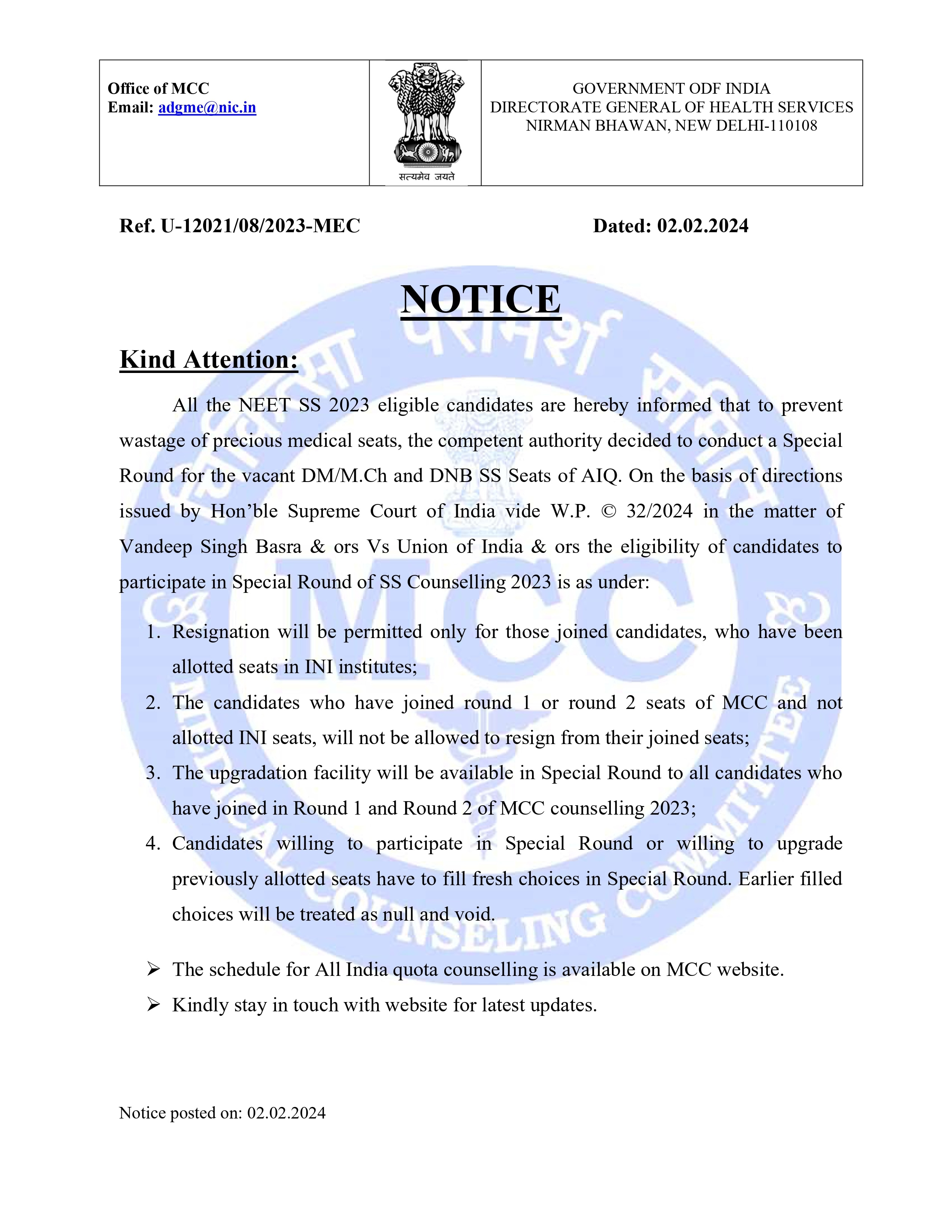 As per the Counselling schedule, the choice-filling procedure will be conducted between February 5 to February 7, 2024(8:00 AM). Meanwhile, the choice locking facility will be available from 08:00 PM of February 6 upto 08:00 A.M of February 7, 2024. Going through the schedule, the seat processing will be held from February 7 to 8, 2024. MCC will announce the NEET SS 2023 Counselling Special Round Result on February 9. Selected candidates can report to the allotted medical college between February 10 to February 15, 2024. For more details, refer to the official website of MCC. A copy of the notice has been given below:-