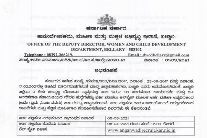 Karnataka Anganwadi Recruitment 2021: Women and Child Development Department, Karnataka has sought applications for 170 posts of assistant and helper in Bellary district under Karnataka Anganwadi Recruitment 2021. Interested candidates can apply for these posts online by visiting the official website of Anganwadi, aganwadirecruit.kar.nic.in.