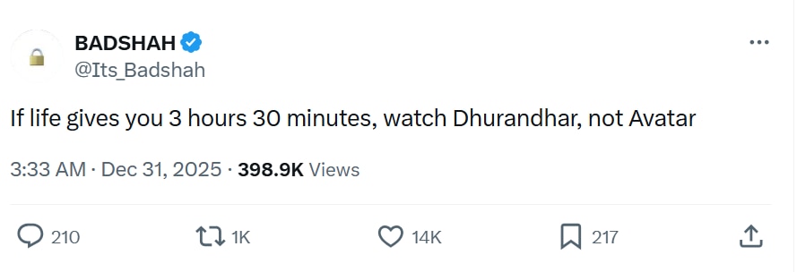 Badshah, known for his bold statements and love for cinema, shared his opinion on X (formerly Twitter), urging his fans, “If life gives you 3 hours 30 minutes, watch Dhurandhar, not Avatar.” His comment quickly caught attention, especially as Avatar, a high-budget, visually stunning film, has been one of the most anticipated releases of the year. However, Badshah’s strong endorsement of Dhurandhar showcased his belief in the movie’s quality and action-packed storyline.