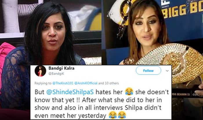 Yesterday, at the Bigg Boss Grand Finale, Shilpa seemed to have avoided Arshi Khan. Yes, you heard it right. Ex-contestant Bandgi Kalra took to her micro-blogging site to tweet about the same and hinted that a cold war was still on between Shilpa and Arshi. The latter said, she did not even speak to Arshi after stepping out of the house as winner of Bigg Boss 11. Bandgi wrote, “But @ShindeShilpaS hates her 😂 she doesn’t know that yet !! After what she did to her in show and also in all interviews Shilpa didn’t even meet her yesterday 😂😂” Well, neither Arshi or Shilpa commented on this. ALSO READ: Exclusive! Bigg Boss 11 Contestant Hina Khan Has Committed A Huge Blunder, Says Arshi Khan