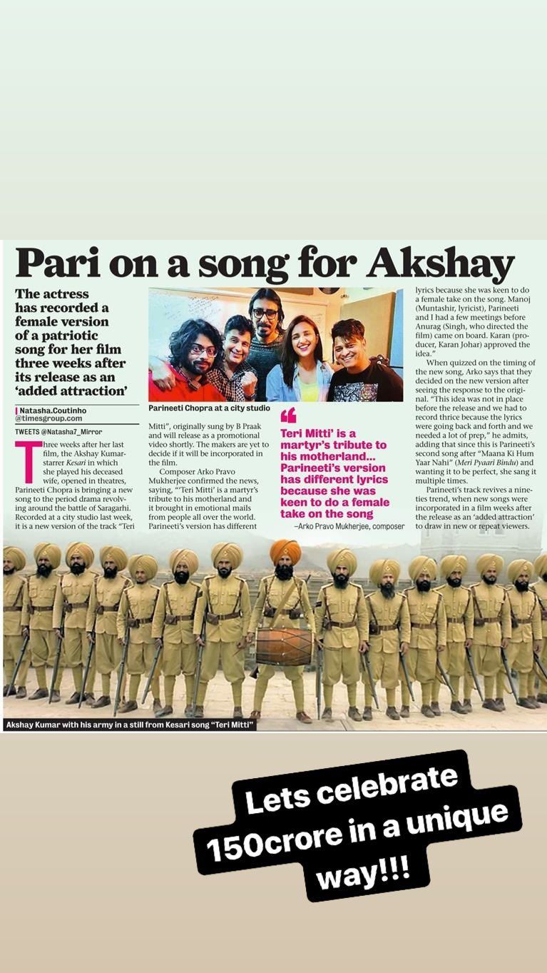 Parineeti, who plays Akshay’s love interest in Kesari is celebrating the film’s success in a unique way. The actor took to her Instagram stories to reveal that she “has recorded a female version of the patriotic song for her film three weeks after its release as an ‘added attraction’.” Sharing the story, she wrote, “Let’s celebrate 150 crore in a unique way!!!”.