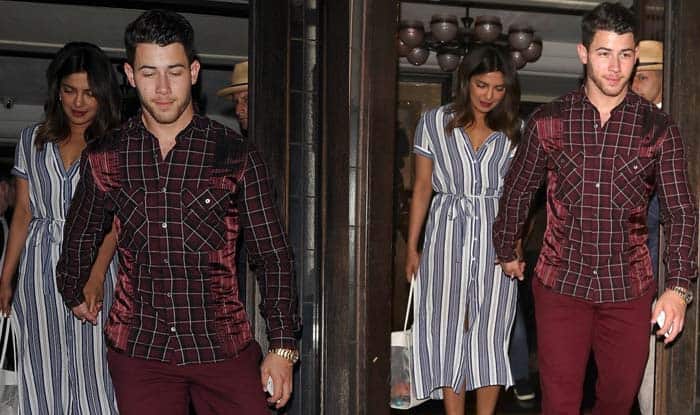 The actress looked stunning in a white and blue buttoned striped dress. She completed her look with white heels and a white bag. Nick, on the other hand, looked handsome in a maroon checkered shirt and matching pants. The two were spotted walking hand in hand as they left the venue together. Take a look at the pictures of the two shared by the actress’s fan club on social media.