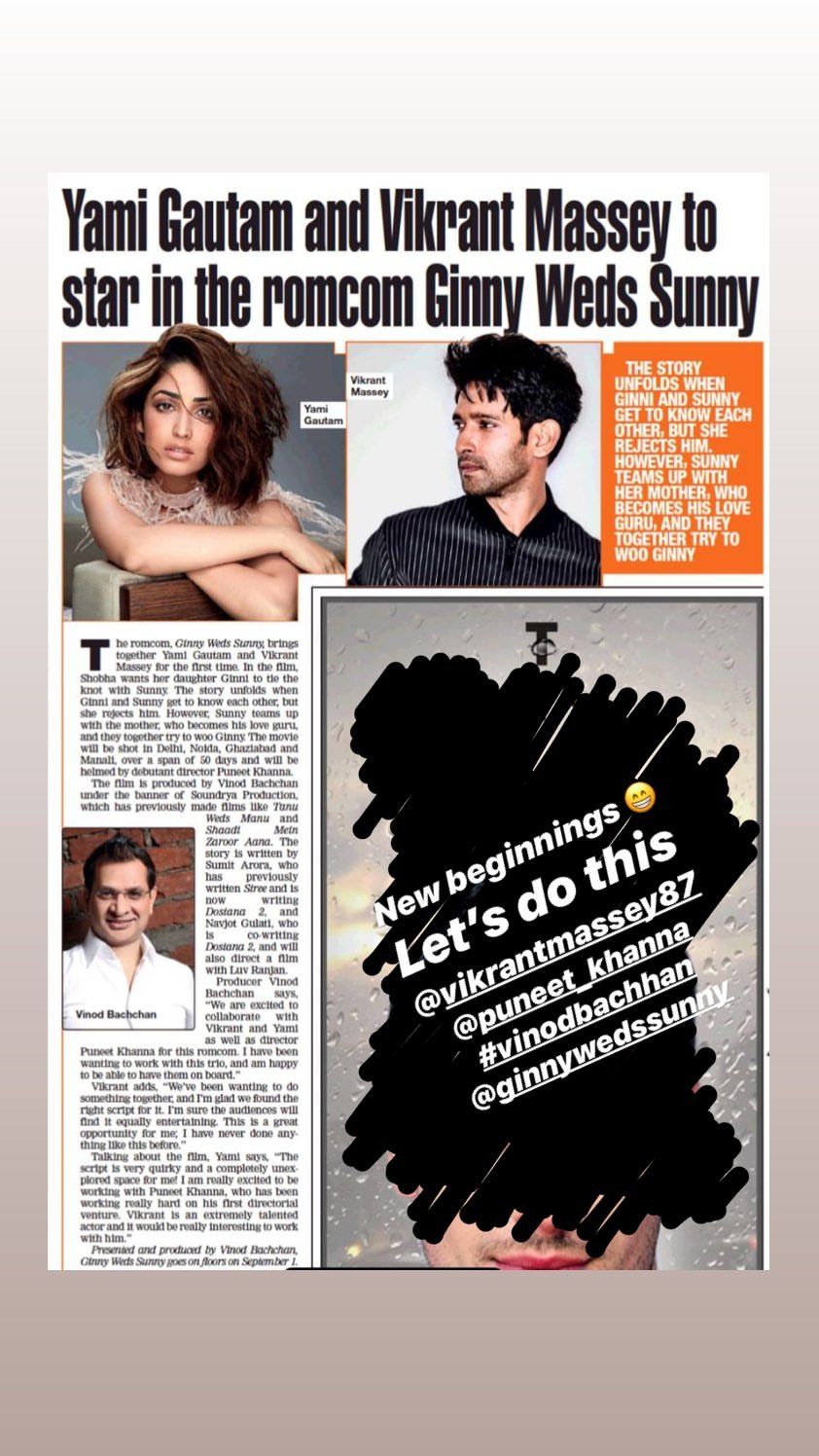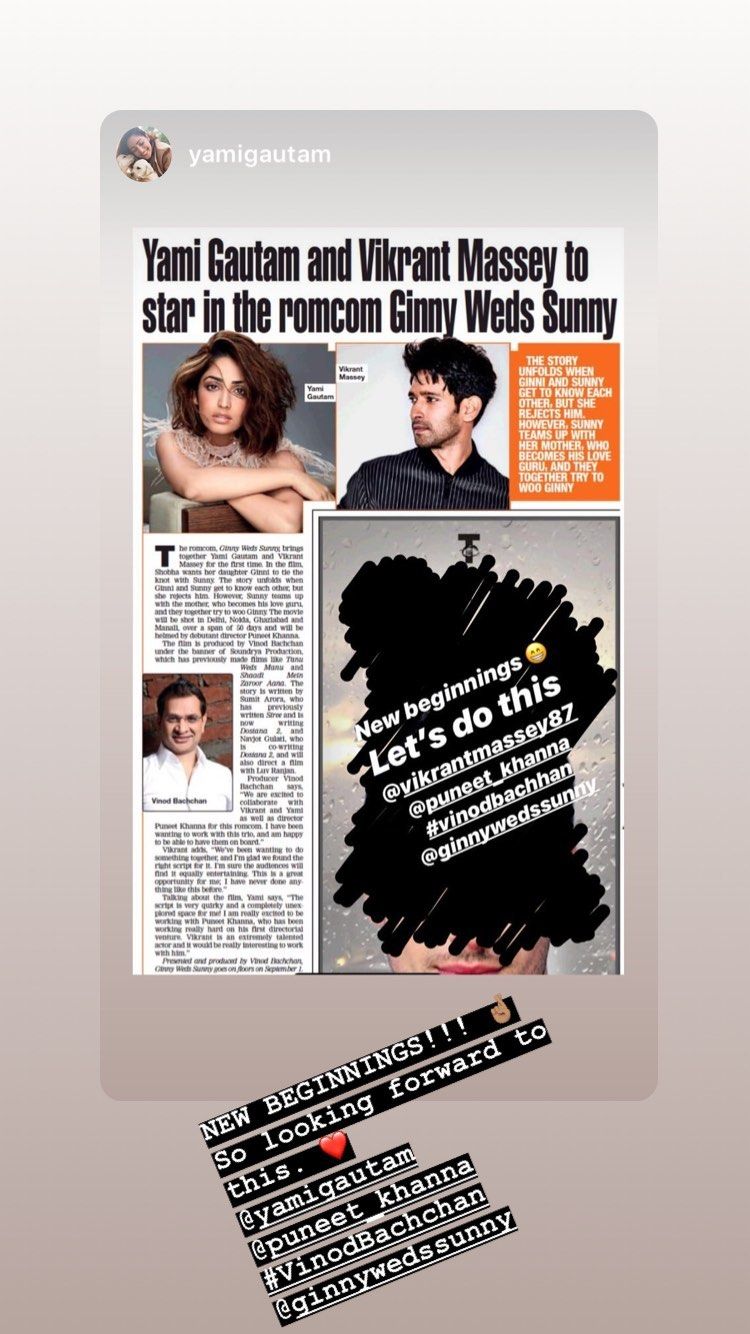 Taking to her Instagram handle, Yami shared a clipping from a news daily that gave more details into the upcoming movie and captioned it, “New beginnings. Let’s do this” (sic). Reposting the same, Vikrant replied, “So looking forward to this” and punctuated it with a red heart emoji.