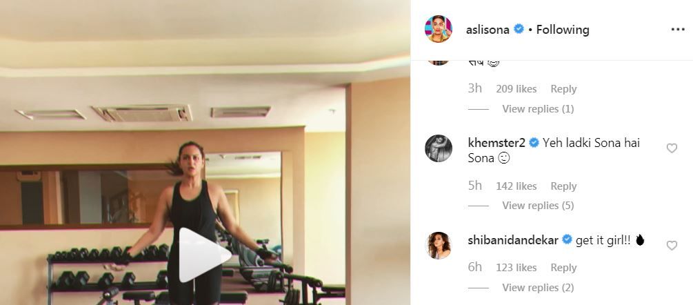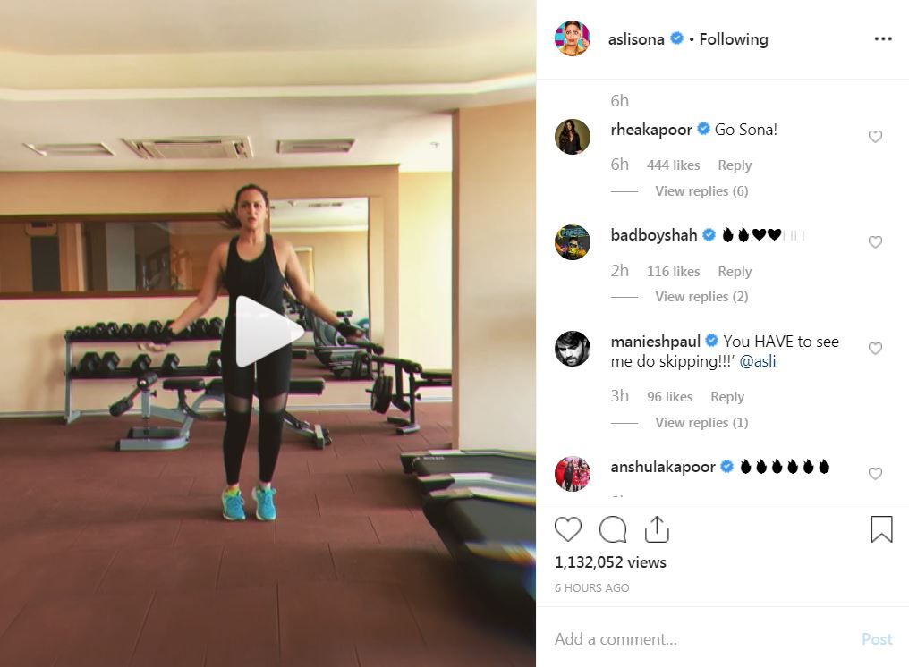 In the video that Sonakshi shared on her Instagram handle, the Dabangg 3 star can be seen donning an all black athleisure wear as she effortlessly skipped the rope in different ways and at high speed, in tandem with Badshah’s song playing in the background at the gym. She captioned the post as, “Skippin” that lazy sunday vibe today… you? how u like my new gym jam @badboyshah?” (sic). The post instantly collected over 1.1 million views and is still going strong. While Rhea commented, “Go Sona!” (sic), host Maniesh teased, “You HAVE to see me do skipping!!!’ @asli” (sic) and Badshah left hearts and fire emojis in the comments section. Kunal’s witty comment read, “Yeh ladki Sona hai Sona” (sic), Shibani cheered, “get it girl!!” and Anshula Kapoor too left fire emojis.