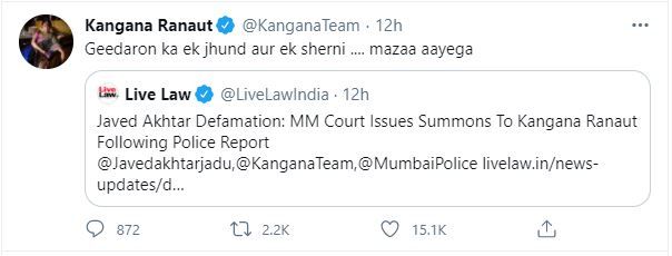 Soon after she was summoned, Kangana Ranaut took to her Twitter account to react on the same. She wrote it will be fun to see a pack of jackals with one lioness. “Geedaron ka ek jhund aur ek sherni …. mazaa aayega”, wrote Kangana while sharing an article of her summon.