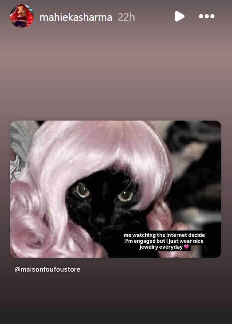 Mahieka Sharma finally broke her silence after a blingy diamond ring on her finger set off engagement whispers with Indian all‑rounder Hardik Pandya. The model turned actress took to Instagram Stories on Friday, posting a quirky picture of a black cat wearing a pink wig.