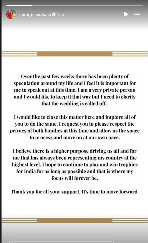 While Smriti, in her Instagram stories, wrote, “Over the past few weeks, there has been plenty of speculation around my life, and I feel it is important for me to speak out at this time. I am a very private person, and I would like to keep it that way, but I need to clarify that the wedding is called off.”
