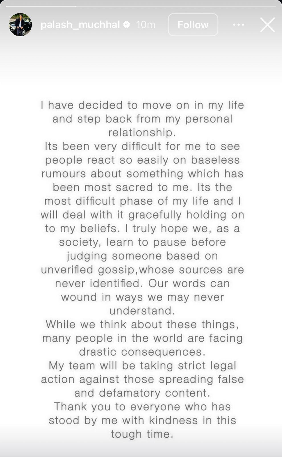 Palaash also mentioned in his post that his team is taking strict action against people who created a false narrative against him.