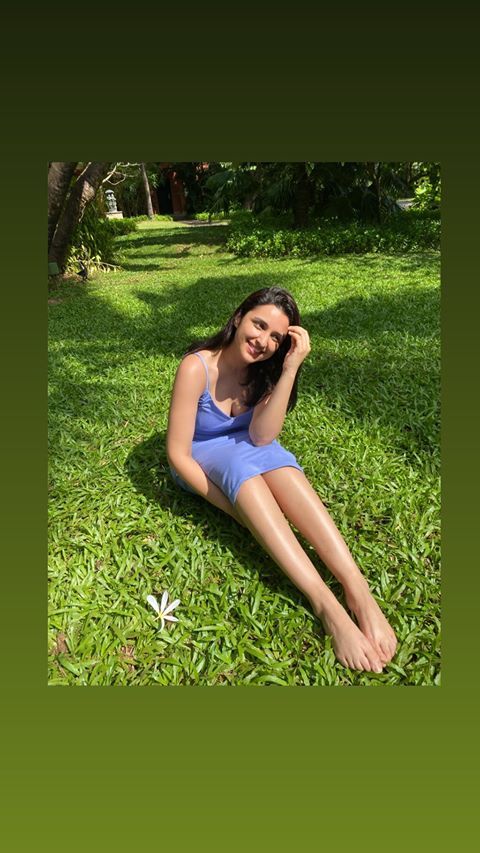Clad in a blue dress with a plunging neckline, she looks hot. She has also shared her pictures enjoying her weekend by sitting on the grass and basking in the sun. Needless to say, she looks hot and gorgeous in the pictures.
