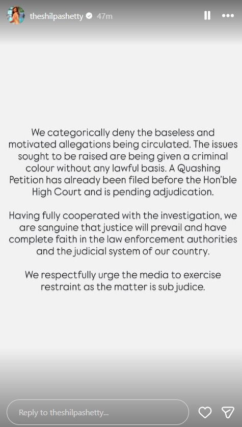 Soon after the reports surfaced, Shilpa Shetty took to Instagram to issue a firm statement. Denying all allegations, she said the claims were “baseless and motivated” and accused them of being given a criminal colour without legal grounds. She confirmed that a quashing petition has already been filed before the High Court and is currently pending.