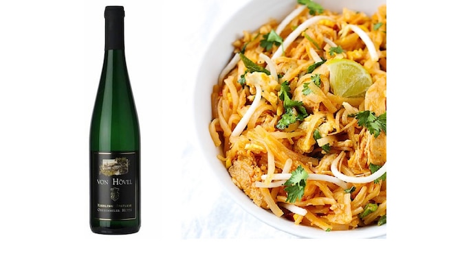 Pad Thai is a traditional street dish of noodles, which includes sugar, tamarind, dried shrimp, fish sauce and is usually served with crushed peanuts or chili and lime. For this dish, look for German Riesling, especially those labeled from the first two categories in the range from semi-sweet to the sweetest: Kabinett, spätlese, auslese, beer en auslese, to trocken beer en auslese. (The latter three are dessert wines and, therefore, are too sweet.)