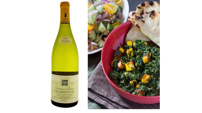[Domaine de Bernier unoaked Chardonnay (France) | Photo Source: Pinterest | Saag paneer. | Photo Source: Pinterest]