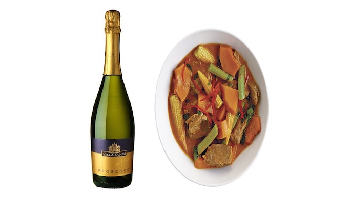 [Italian Prosecco sparkling wine | Photo Source: Pinterest | Thai curry | Photo Source: finecooking.com]