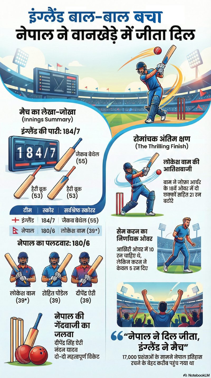 नेपाल ने इंग्लैंड के खिलाफ लक्ष्य का बहुत ही बहादुरी से पीछा किया. मुंबई का वानखेड़े स्टेडियम पर पूरी तरह से नेपाल के फैंस से भरा हुआ था. और साल वह 2026 का बड़ा उलटफेर करने के बहुत करीब पहुंच गया था. अपने यूट्यूब चैनल पर साझा किए गए इस वीडियो में चोपड़ा ने जोर देकर कहा कि नेपाल जैसी टीम के साथ किसी पार्टी में अस्थायी मेहमान की तरह व्यवहार नहीं किया जा सकता.