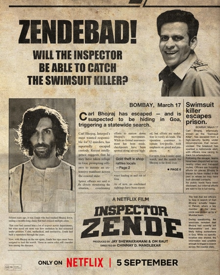 सच्ची घटनाओं पर बनी मनोज बाजपेयी और जिम सर्भ स्टारर फिल्म ‘इंस्पेक्टर जेंडे’ की रिलीज डेट सामने आ चुकी है. मेकर्स ने बताया कि फिल्म 5 सितंबर को नेटफ्लिक्स पर रिलीज होने के लिए तैयार है. यह फिल्म सच्ची घटनाओं से प्रेरित है और इसमें मनोज बाजपेयी इंस्पेक्टर मधुकर जेंडे की भूमिका में हैं, जबकि जिम सर्भ एक चालाक अपराधी कार्ल भोजराज, जिसे ‘स्विमसूट किलर’ के नाम से जाना जाता है, का किरदार निभा रहे हैं. फिल्म का लेखन और निर्देशन चिन्मय डी. मांडलेकर ने किया है.