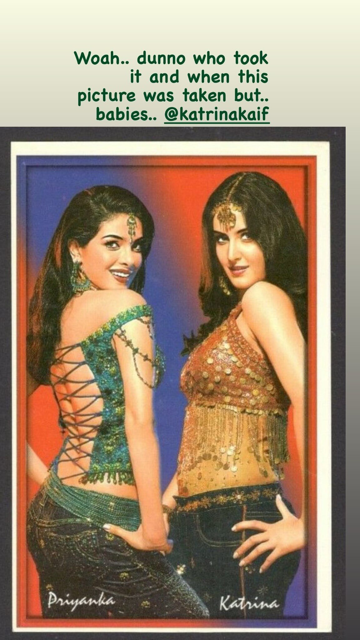 दरअसल ये फोटो किसने ली है इसकी जानकारी किसी को भी नहीं है. इंस्टाग्राम के स्टोरी पर फोटो साझा करते हुए प्रियंका ने लिखा, “वाह…पता नहीं इसे किसने लिया और यह तस्वीर कब ली गई लेकिन बेबी…@katrinakaif।” आपको बता दें ये एक्ट्रेस साथ में कभी काम नहीं किया है और इनकी आने वाली फिल्म जी ले जरा थी, जो फिलहाल ठंडे बस्ते में चली गई है,