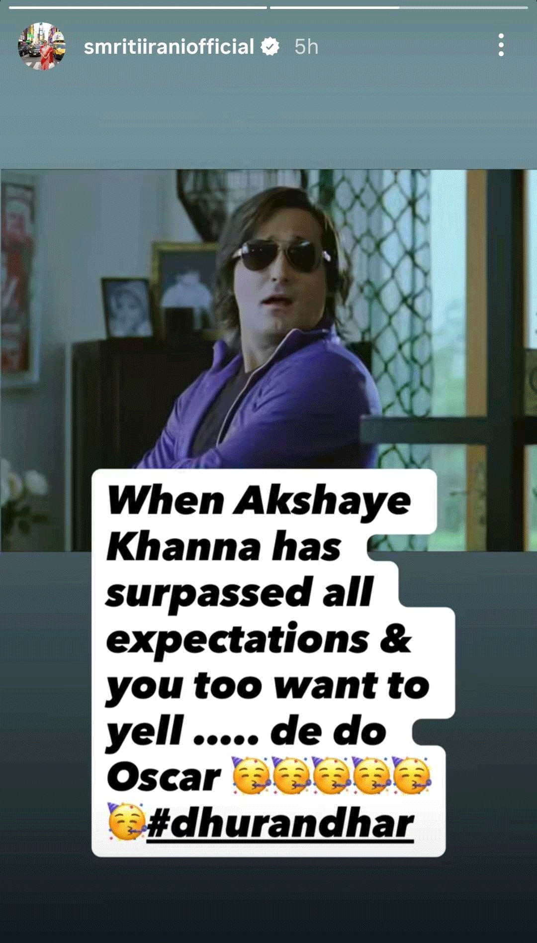 स्मृति ईरानी ने निर्देशक आदित्य धर की भी तारीफ की. उन्होंने लिखा, ”आदित्य धर एक बेहतरीन कहानीकार हैं और रिसर्च में भी उनका कोई जवाब नहीं. अक्षय खन्ना की भूमिका में उन्होंने जो भावनात्मक गहराई दिखाई, वह उनकी मेहनत का सबूत है. वहीं, रणवीर सिंह की आंखों में छुपी भावनाएं और अर्जुन रामपाल के खतरनाक अंदाज भी देखने लायक हैं.”