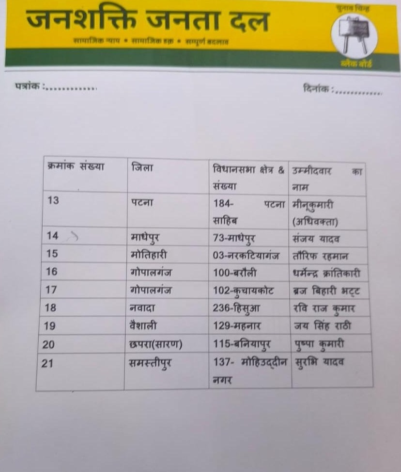 बिहार चुनाव 2025: जनशक्ति जनता दल ने जारी की 21 उम्मीदवारों की सूची, तेज प्रताप महुआ से चुनाव लड़कर बना रहे हैं अलग पहचान