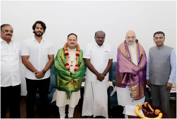 BJP national president JP Nadda tweets, “Met Former Chief Minister Karnataka and JD(S) leader HD Kumaraswamy in the presence of our senior leader and Home Minister Amit Shah. I am happy that JD(S) has decided to be the part of National Democratic Alliance. We wholeheartedly… pic.twitter.com/8dBFFhnfxN