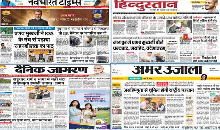 नई दिल्ली: देश की राजधानी दिल्ली से प्रकाशित प्रमुख अखबारों के पहले पेज पर खबरों का चयन और प्रस्तुति पर एक दृष्टि… नवभारत टाइम्स के पहले पेज पर लीड खबर ‘ प्रणव मुखर्जी ने आरएसएस के मंच से पढ़ाया सहनशीलता का पाठ’ है. अन्य खबरों में ‘ गुड़गांव में कंपनी ने नौकरी से निकाला तो एचआर मैनेजर पर फायरिंग कर दी’, ‘दिल्ली एनसीआर में खतरनाक हुआ ओजोन पैल्यूशन’, ‘शिवसेना पर नहीं चला अमित शाह का जादू’ ‘पत्नी के एटीएम कार्ड ने पति नहीं निकाल सकता पैसे’, ‘अलगाववादियों से भी बातचीत’ आदि हैं.