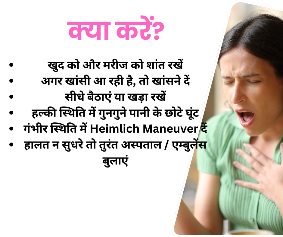 अगर हालत हल्की है और सांस ठीक से आ रही है, तो छोटे-छोटे घूंट में गुनगुना पानी पिलाया जा सकता है, ध्यान रखें कि पानी ज़ोर से न पिलाएं. अगर हालत गंभीर हो और व्यक्ति सांस न ले पा रहा हो तो Heimlich Maneuver किया जा सकता है. इसमें पीछे से खड़े होकर नाभि के ऊपर पेट पर दोनों हाथों से ऊपर की ओर झटका दिया जाता है. यह तरीका सिर्फ आपात स्थिति में और जानकारी होने पर ही करें, अगर खाना बाहर न निकले, सांस लेने में दिक्कत बढ़े या बेहोश होने लगे, तो तुरंत अस्पताल जाएं या एम्बुलेंस बुलाएं. देर करना खतरनाक हो सकता है.