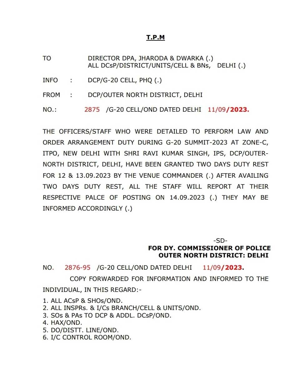 G20 की सुरक्षा में तैनात रहे दिल्ली के पुलिसकर्मियों को रेस्ट के लिए मिलेगी दो दिन की छुट्टी, आदेश जारी