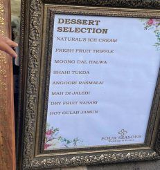 शादी में कोई भी भोजन बिना मिठाइयों के पूरा नहीं होता है और भागवत मान की शादी में मेहमानों के लिए फ्रेश फ्रूट ट्रिफ़ल, मूंग दाल हलवा, शाही टुकड़ा, अंगूरी रसमलाई और ड्राई फ्रूट रबड़ी जैसी कई तरह की मिठाइयाँ होंगी. स्वास्थ्य के प्रति जागरूक रहने वाले भी निराश नहीं होंगे क्योंकि विभिन्न प्रकार के सलाद भी उपलब्ध होंगे.