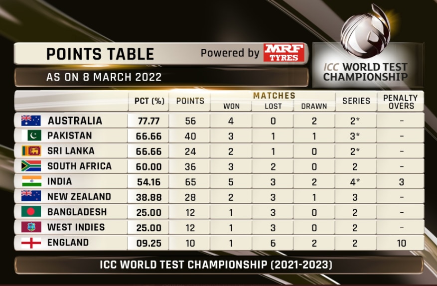 विश्व टेस्ट चैंपियनशिप अंक तालिका 2021-23