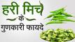 Green Chilli Benefits: हरी मिर्च केवल व्यंजनों का स्वाद बढ़ाने के काम नहीं आती. इसे खाने के ऐसे बहुत से शारीरिक फायदे हैं. आपको बता दें, हरी मिर्च में औषधीय गुण पाए (Green chilli benefits) जाते हैं जिस वजह से यह कई तरह के रोगों से लड़ने (Health benefits of green chilli) में सक्षम है. हरी मिर्च खाने से भोजन जल्दी पच जाता है. साथ ही पेट में भारीपन और मुंह में छालों की समस्या भी दूर रहती है. वीडियो में जानें हरी मिर्च के ऐसे ही और गुणकारी फायदों के बारे में.