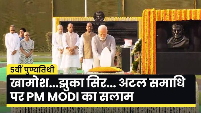 PM Modi Tribute To Vajpayee: Atal Bihari Vajpayee की पांचवी पुण्यतिथी के मौक पर PM Narendra Modi ने Atal Samadhi Sthal पहुंच कर Vajpayee को नमन किया. PM Modi के साथ ही President Droupadi Murmu भी Vajpayee को श्रद्धांजलि देने पहुंची. Rajnath Singh, Amit Shah समेत NDA के तमाम नेता अटल समाधि स्थल पर मौजूद हैं.