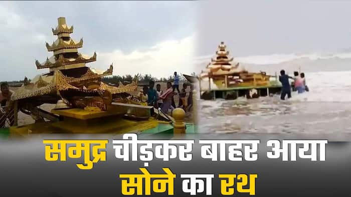 Golden Chariot Found in Andhra Pradesh: आंध्र प्रदेश से एक हैरान कर देने वाला वीडियो सामने आया है. यहां समुद्र की लहरो के बीच अचानक एक रहस्मयी रथ नज़र आया. जो कि सोने की तरह दिख रहा है. स्थानीय इस रथ को देखकर हैरान रह गए और फौरन ही इसकी जानकारी पुलिस को दी. पुलिस ने फिलहाल इस रथ को अपने कब्जे में ले लिया है. ऐसा माना जा रहा है कि यह रथ म्यांमार से बहकर आंध्र प्रदेश पहुंचा है. वीडियो में जानें पूरा मामला.