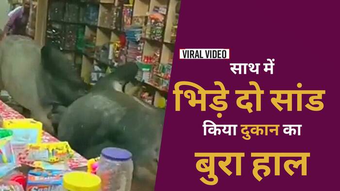 इस वीडियो में एक दुकानदार अपनी दुकान में घुसे दो सांडों को निकलने की कोशिश कर रहा है.