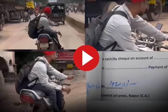 सामने आए वीडियो में देख सकते हैं कि भीड़भाड़ वाले रोड पर शख्स स्टाइल में बाइक पर बैठा है और ऐसे ही इसे कंट्रोल कर रहा है. वो बाइक को रेस देता है और उसका एक हाथ में हवा में है. मगर कुछ देर बाद बेचारे के साथ जो कुछ हुआ शायद उसे अंदाजा ना हो. दरअसल शख्स को दूसरों की जान खतरे में डालने वाला स्टंट करता देख पुलिस पर उसकी नजर पड़ी और 4200 रुपये का चालान काट दिया. चालान कटा तो बेचारा कान पकड़कर खड़ा हो गया और दोबारा ऐसी गलती ना करनी की शपथ ली.