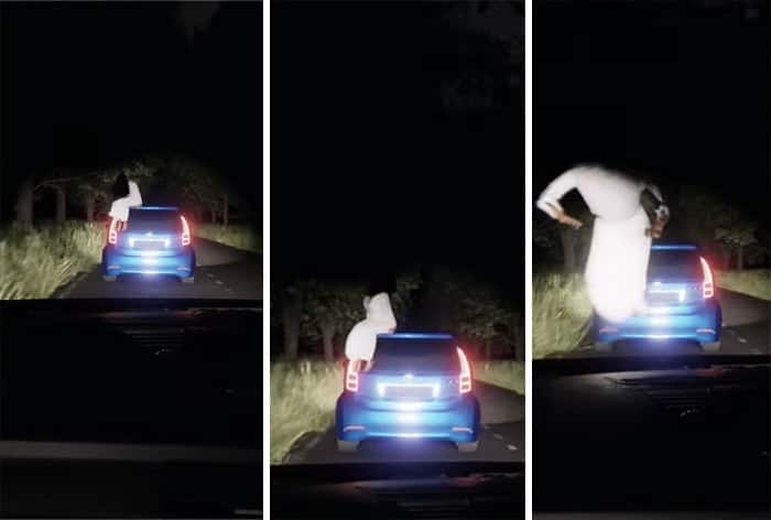 सोशल मीडिया पर वायरल हो रहे इस वीडियो में देखा जा सकता है कि रात के अंधेरे में सड़क पर दो गाड़ियां अपनी मंजिल की ओर जा रही हैं. रास्ता किसी जंगल से होते हुए जा रहा है. अचानक से आगे चल रही नीले रंग की गाड़ी पर सफेद कपड़ों में एक महिला बैठी दिख रही है. नजारा बिल्कुल किसी डरावनी फिल्म की तरह है. इसमें ऐसा दिखाने की कोशिश की गई है कि गाड़ी पर एक ‘भूतनी’ बैठी हुई है. वो उछलकर अचानक से पीछे चल रही गाड़ी पर बैठ जाती है.