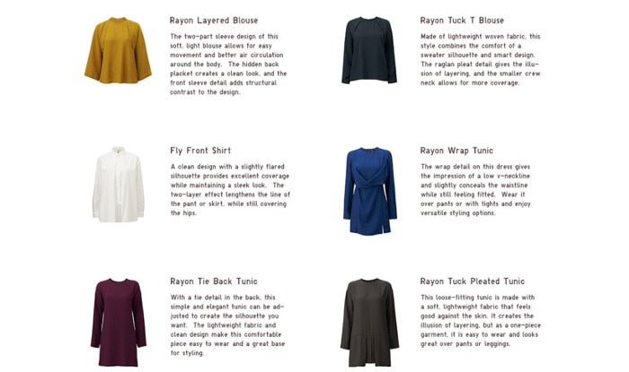 Uniqlo, a Japanese clothing brand best known for its ultra-cool urban and casual wear, partnered with UK-based designer and blogger, Hana Tajima, to create everyday wear of detailed designs and comfortable fabrics. The clothes, as depicted on Uniqlo’s website, appear light and airy, printed in solid colors and are conservative yet flattering. Launched for the first time with success last June, the line marketed their new collection in January.