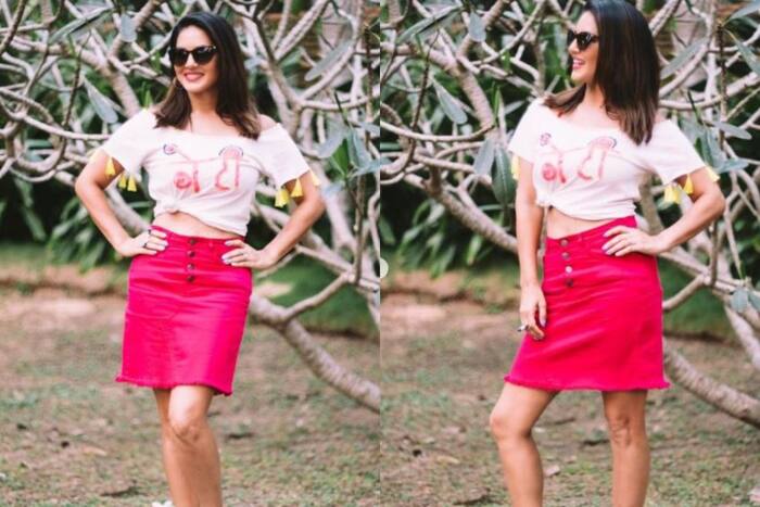 Actor and Splitsvilla host Sunny Leone lightened up Saturday afternoon with her mesmerising pictures from the sets of the reality show. She opted for a quirky outfit and you can easily pull it up for your weekend outing. The actor opted for a white top designed by Niharika Pandey which featured a hand-embroidered slogan that reads ‘Beti’ in Hindi. The top also has yellow tassels attached to its sleeves. She paired up her crop top with a neon-pink denim skirt from the brand Freakins.