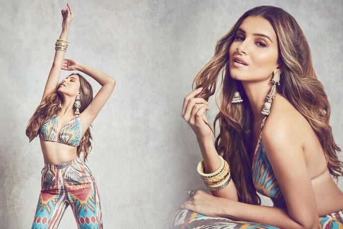 Tara Sutaria was seen exuding hotness in ekat printed mimosa co-ord set. The set comprises of voguish sultry bralette and a pair of matching pants giving perfect boho vibes. The ensemble featured ekat pattern with backless detailing, plunging neckline and straight fit pants. To complete her look, Tara went with chunky accessories including statement jhumkis, silver nose ring and silver bangles that matched with her outfit beautifully. A pair of white heels were chosen to round off the look. For glam picks, the diva went with subtle eyeshadow, sharp contour, dazzling highlighter, light-pink lip shade and glowing skin. Tara styled her silky tresses open in loose ways that made her look stunning.