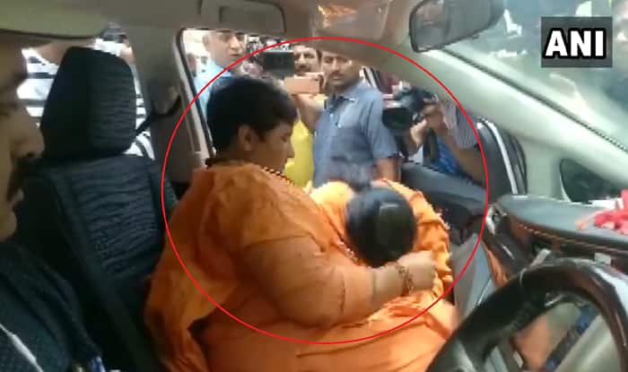 Bharti, who is not contesting the election but has won from Bhopal in the past, was seen consoling Pragya Thakur, who was seated in an SUV, wiping her tears.