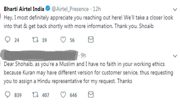 New Delhi, June 18: While trying to please an upset customer, telecommunications major Bharti Airtel managed to make many others very angry. All the company had done was succumbing to a customer’s request for a ‘Hindu customer service representative’ to speak to as she couldn’t trust a Muslim executive’s ‘working ethics’. Pooja Singh, a Lucknow resident, took to Twitter to complain about Airtel’s poor DTH service. She claimed that when she called for reinstallation of DTH service, the company’s service engineer was extremely rude to her. The company responded fast, though its only fault was that an unsuspecting Muslim customer care executive replied to Singh’s complaint. Shoaib cheerily assured Singh that they were looking into her complaint and would get back soon. At which, Singh said: “Dear Shohaib, as you’re a Muslim and I have no faith in your working ethics because Kuran may have different version for customer service, thus requesting you to assign a Hindu representative for my request. Thanks.”