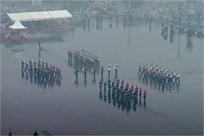 #WATCH | Amid rain lashing the national capital, Military bands enthrall audience at ‘Beating the Retreat’ ceremony at Vijay Chowk in Delhi