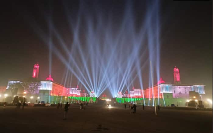 New Delhi: The Rashtrapati Bhawan along with the Rajpath were bathed in tricolour and lazar light on Monday as rehearsals for the Beating the Retreat ceremony were underway in the national capital Delhi. For the first time in the history of India, the Beating the Retreat ceremony, which is held on January 29 every year, will have a laser show and a drone show with background music.