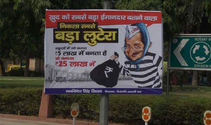 Written in Hindi, it read, “The one who used to call himself an honest leader turned out to be the biggest robber. Arvind Kejriwal constructed rooms in schools costing Rs. 25 lakh, whereas the original expense of constructing one room was just Rs. 5 lakh.” The posters also carried a cartoon caricature of Kejriwal holding a bag of money.