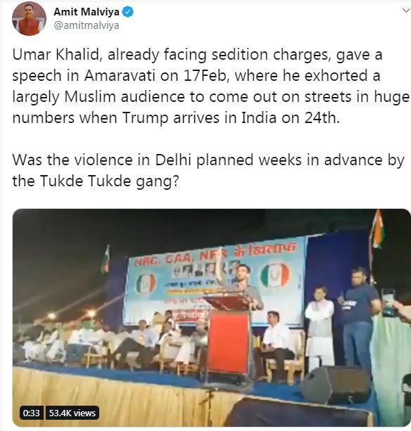 Today, a video was tweeted by several BJP leaders, including its IT cell in-charge Amit Malviya, of the said speech by Khalid. The video, the BJP alleged, shows that the violence was ‘pre-planned’ and timed to coincide with the maiden state visit to India by US President Donald Trump.