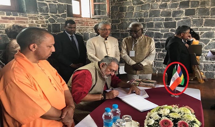 Interestingly, in the two images shared by Singh, where he is addressing the Aapravasi Ghat event and the other writing on visitors’ book, the tricolor can be seen on the table with its green side turned upwards. CM Adityanath also stood beside Singh, along with other dignitaries, but they, as much can be seen in the image, did not notice the inverted flag.