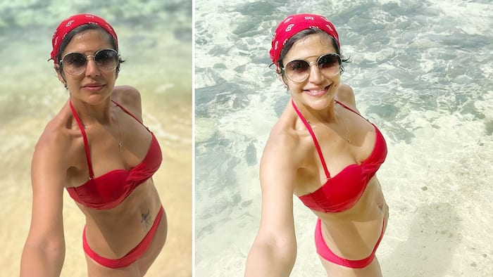 Mandira Bedi flaunted her summer body and revealed a tattoo. The actor accessorised a red bandana and a pair of sunglasses as she basked under the summer sun. Bedi was absolutely glowing as she stood in the silver sands and clear blue waters.